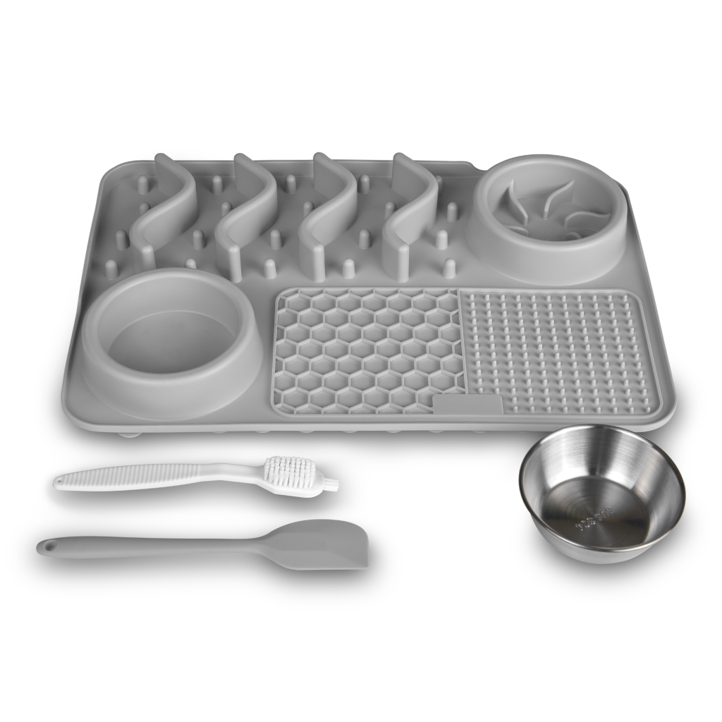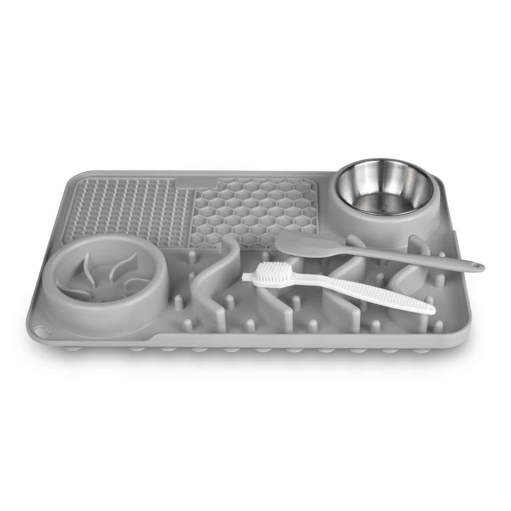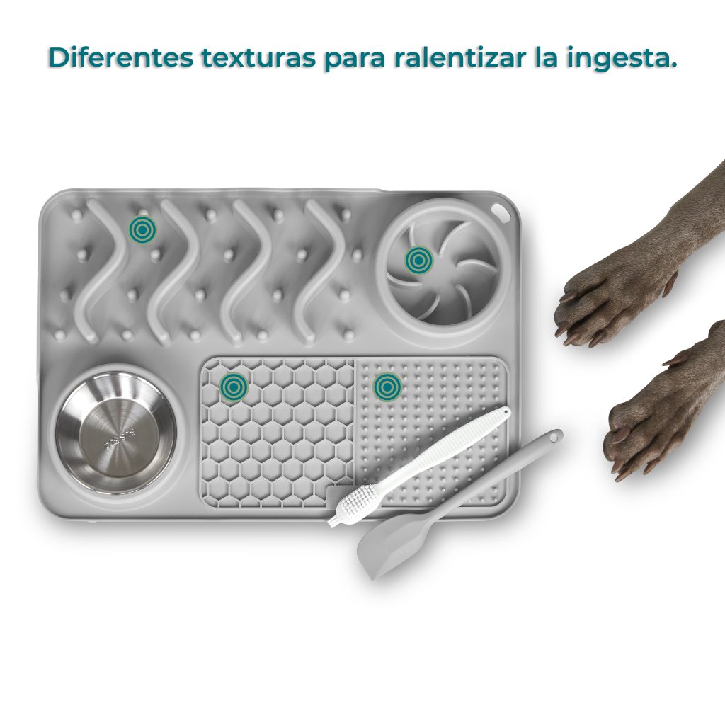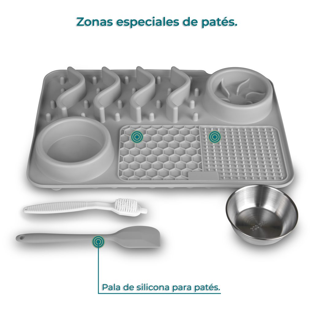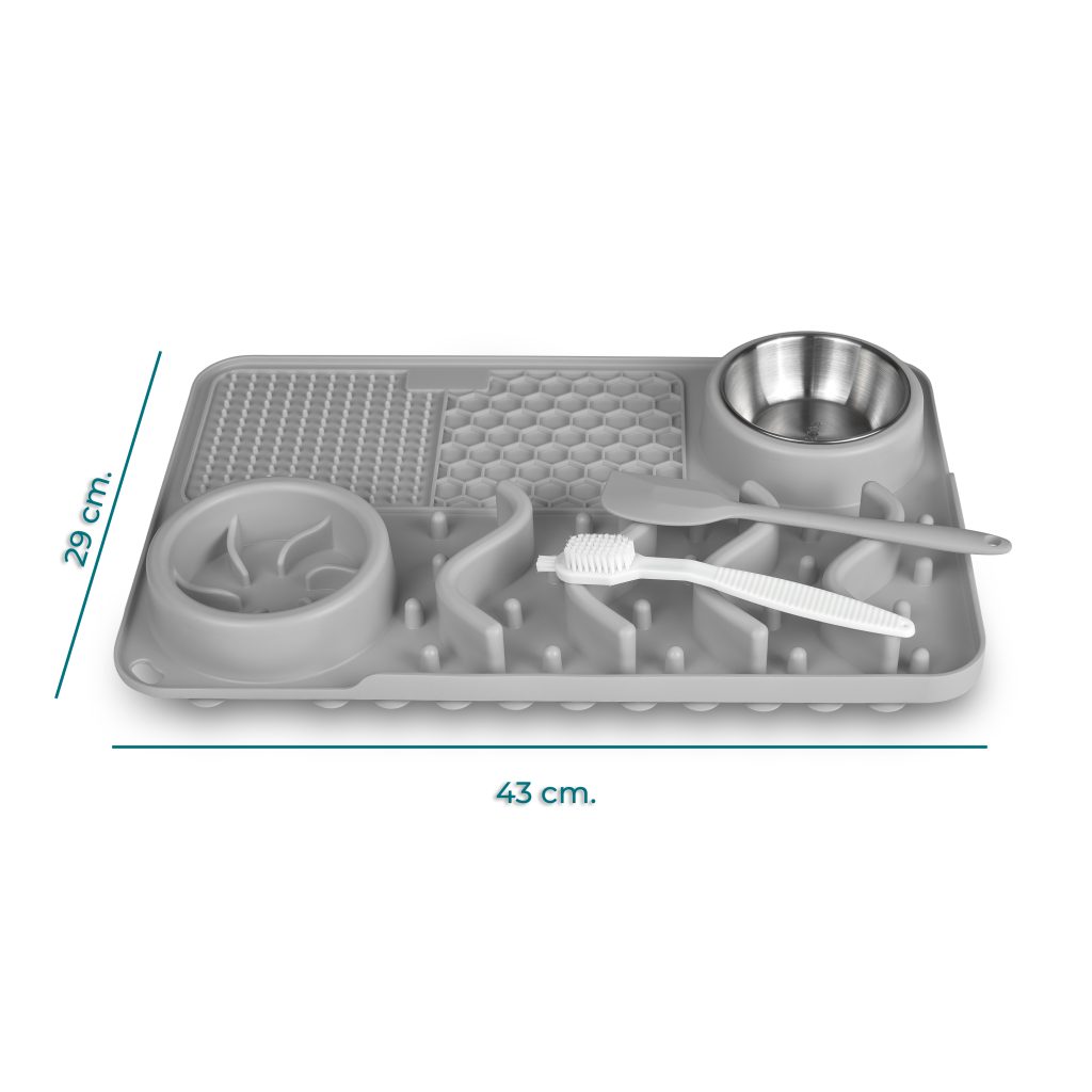 - 🐶🐱 APTO PARA PERROS Y GATOS DE TODAS LAS RAZAS: Este comedero laberinto antideslizante para perros y gatos tiene unas dimensiones de 43 cm de largo y 29 cm de alto. Cuenta con dos cuencos uno para agua y otro para comida de 12 cm de diámetro cada uno. Además, cuenta con 2 alfombrillas para lamer de diferentes texturas + una pala de comida y un kit de limpieza.